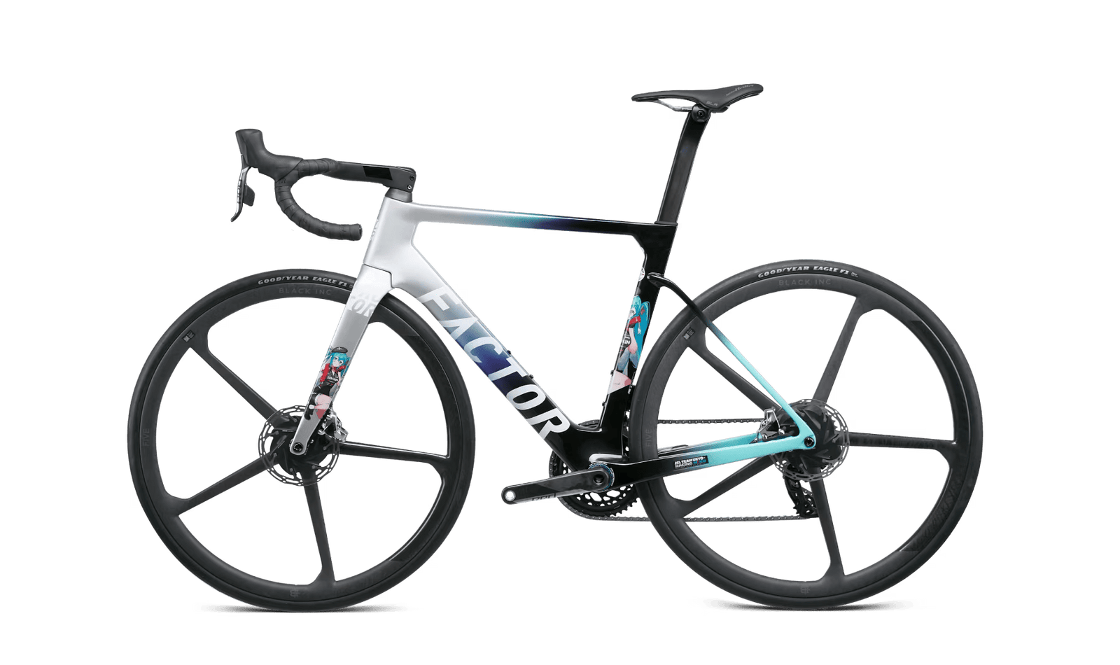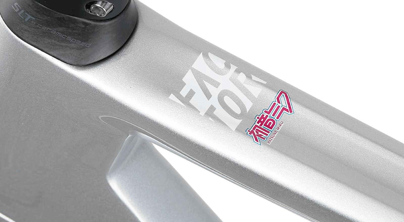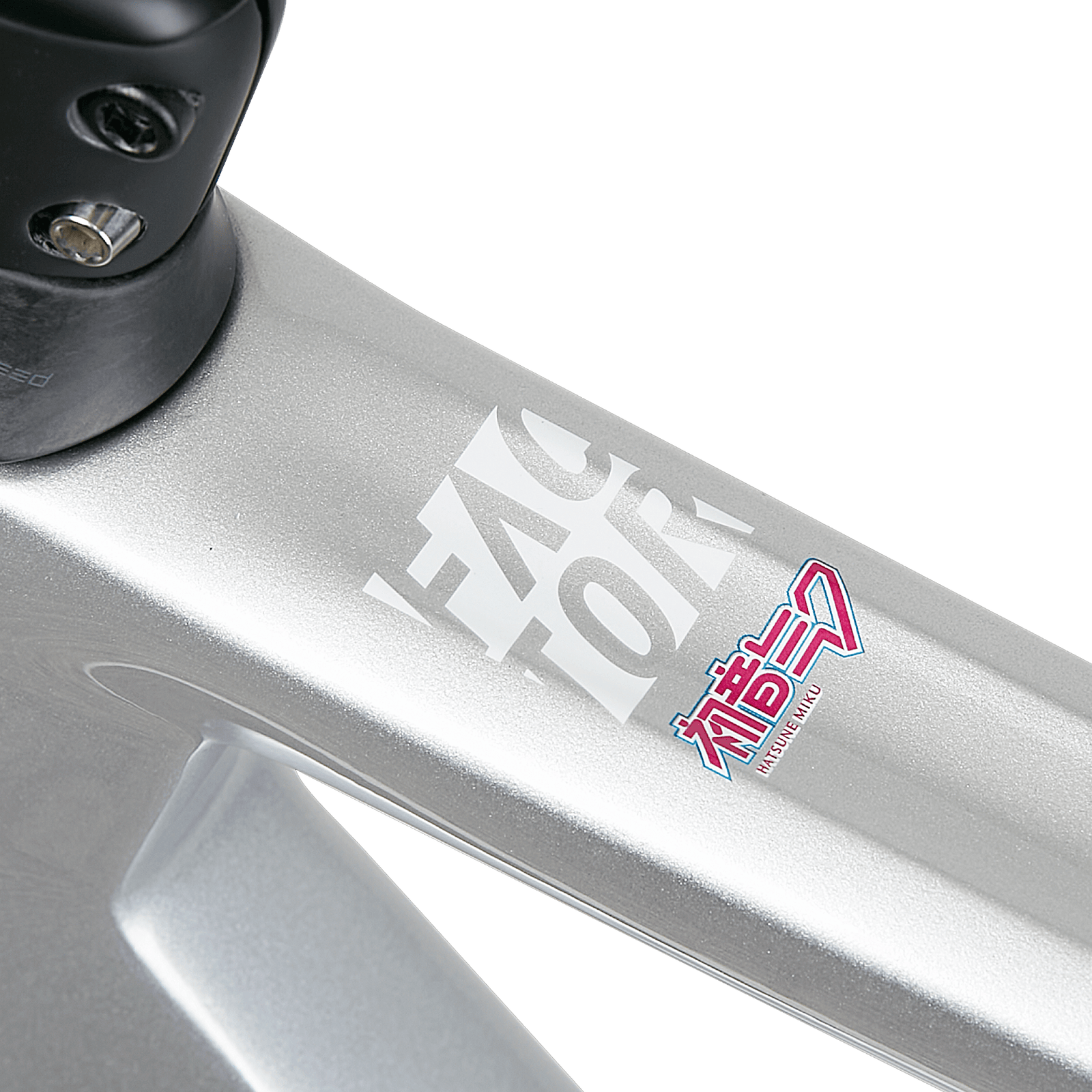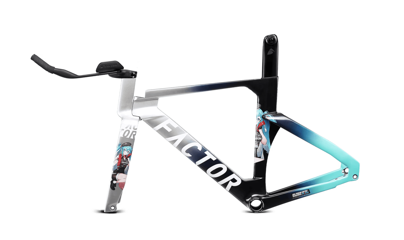 Ce n'est pas la première incursion de Miku dans le monde du sport ; elle a également figuré sur des véhicules de sport automobile Super GT. En fait, l'implication de Miku dans les sports mécaniques a inspiré le design utilisé sur les voitures OSTRO VAM et HANZŌ. Les couleurs de base font référence aux surfaces métalliques et en fibre de carbone des anciennes voitures de course GT3000 de l'équipe, tandis que l'argent métallique et le noir brillant évoquent la vitesse et la performance. Le turquoise utilisé est une citation directe de la chevelure fluide de Hastune Miku. Combinés ensemble, le design et les couleurs donnent une impression de mouvement. Pour mettre en valeur l'ensemble du cadre, l'imagerie détaillée du tube de selle et de la fourche permet d'obtenir des vélos de course vraiment originau