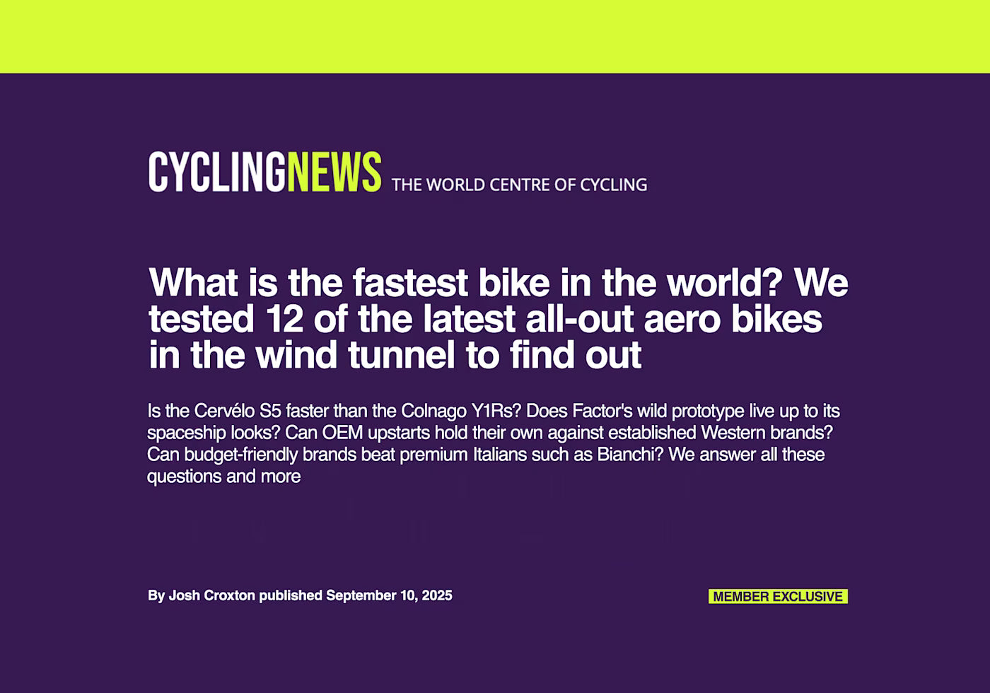 « Dès nos premiers essais en soufflerie du vélo ONE, le résultat a été déterminant : nous avons redéfini les normes de performance aérodynamique pour les vélos », a déclaré Graham. « Nos résultats ont été clairement validés par les récents tests en soufflerie de cyclingnews.com. On y voit un grand nombre de vélos concurrents, et à côté, le ONE, qui a surpassé tous les autres d'une différence presque équivalente à l'écart entre le vélo le plus rapide et le plus lent lors du test. »