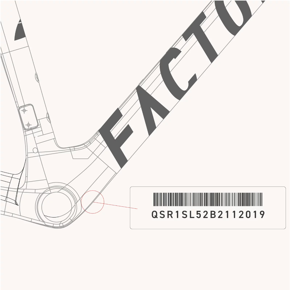 Pour localiser le code de série de votre nouveau vélo Factor, il vous suffit de regarder sous la partie inférieure du boîtier de pédalier, où vous trouverez le code-barres avec le numéro de série en dessous. Tapez ce code dans l'espace prévu ci-dessous pour enregistrer votre cadre auprès de Factor.