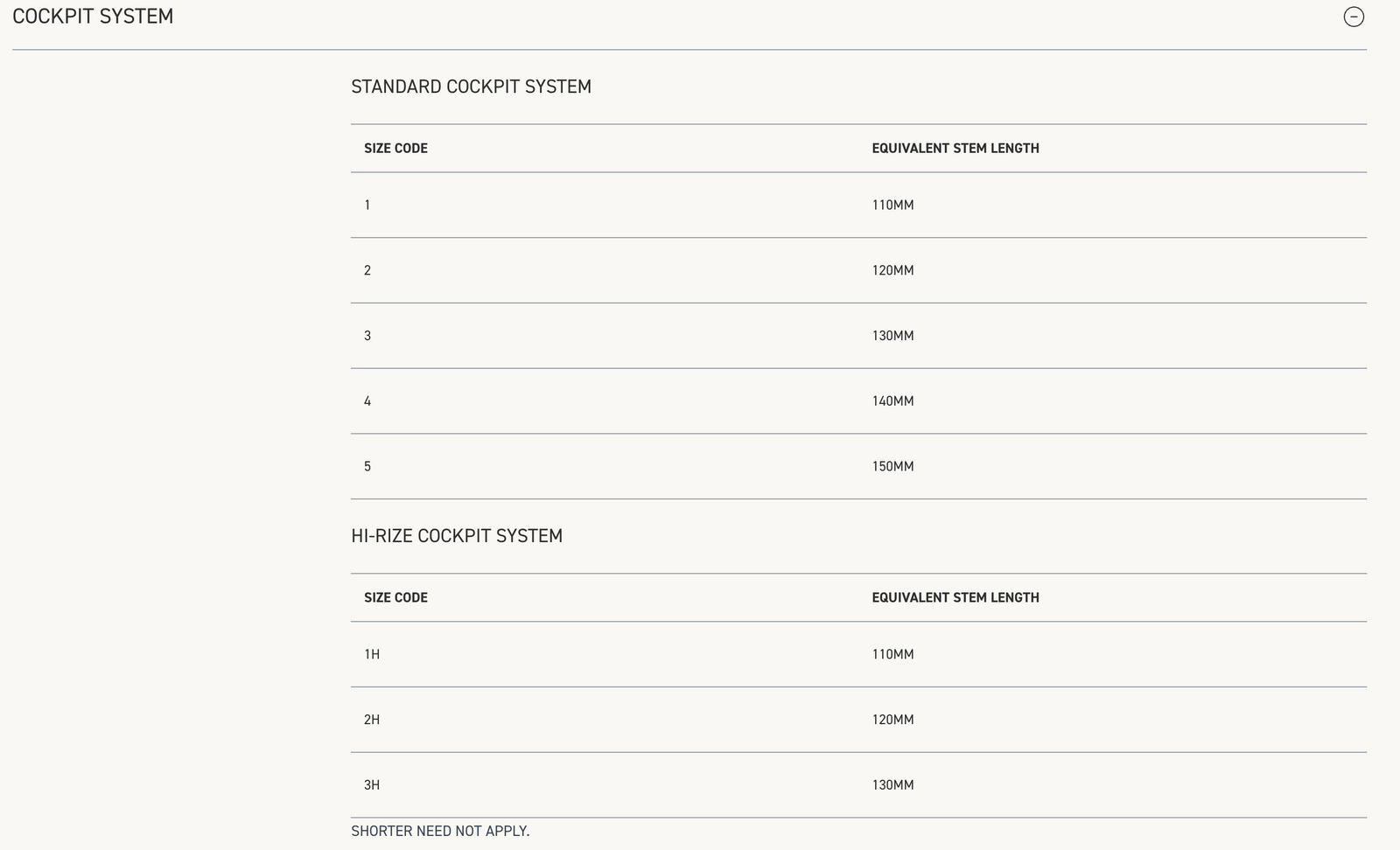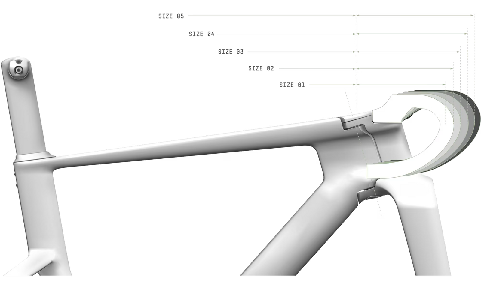 Le modèle ONE utilise un système de cintre intégré sans potence traditionnelle. Les tailles sont désignées 1, 2, 3, 4 et 5, correspondant à des potences équivalentes de 110 à 150 mm, avec trois options de cintre surélevé offrant 20 mm de hauteur supplémentaire.