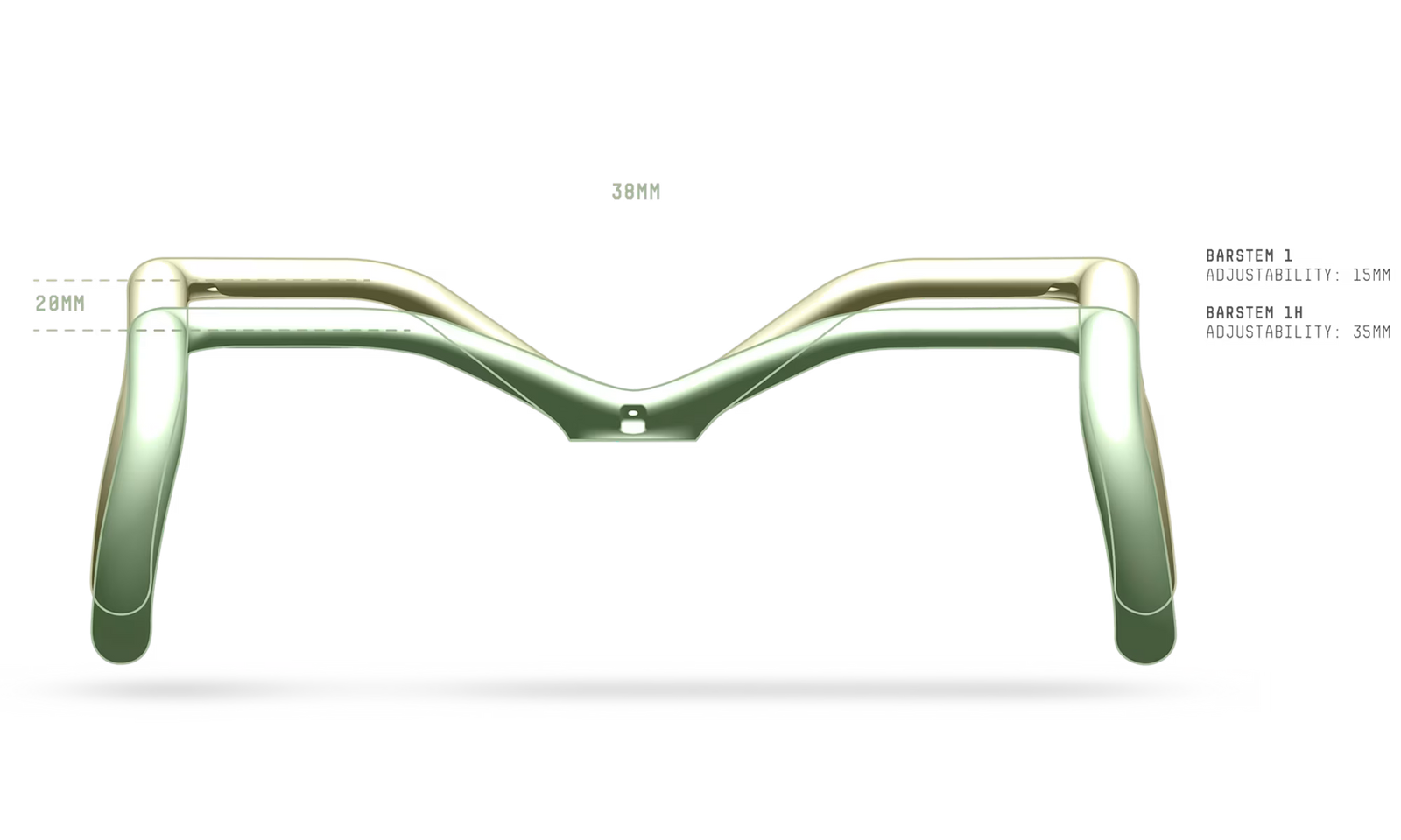- Barre haute : Cette option reproduit fidèlement la position des mains d'un OSTRO VAM grâce à une courbure du guidon rehaussée de 20 mm. Elle est disponible uniquement en tailles 1, 2 et 3 : 1H, 2H, 3H.